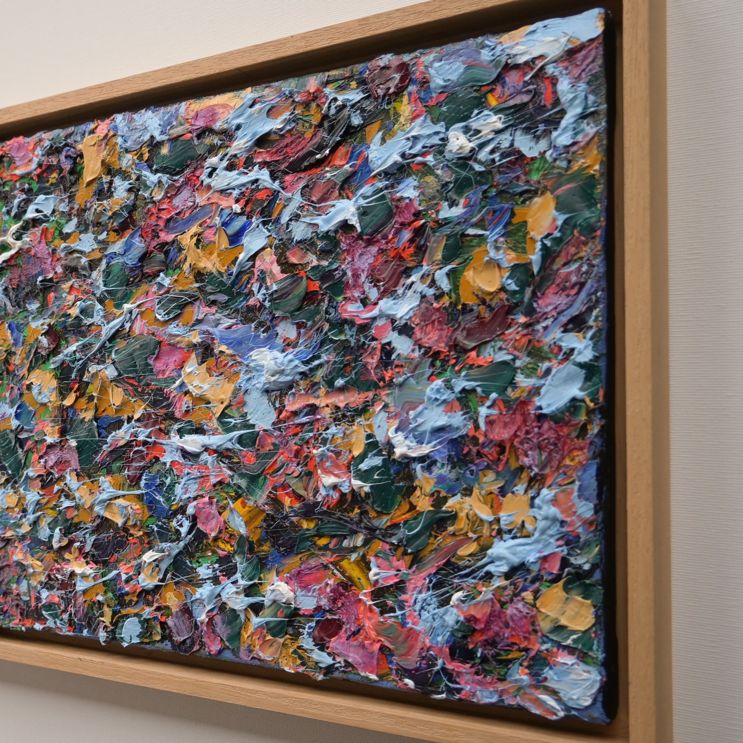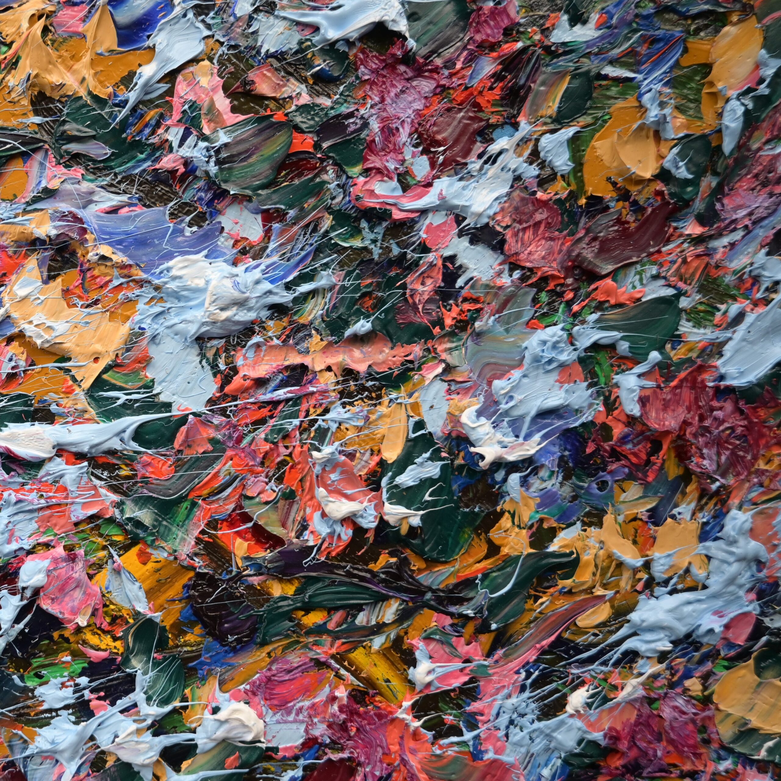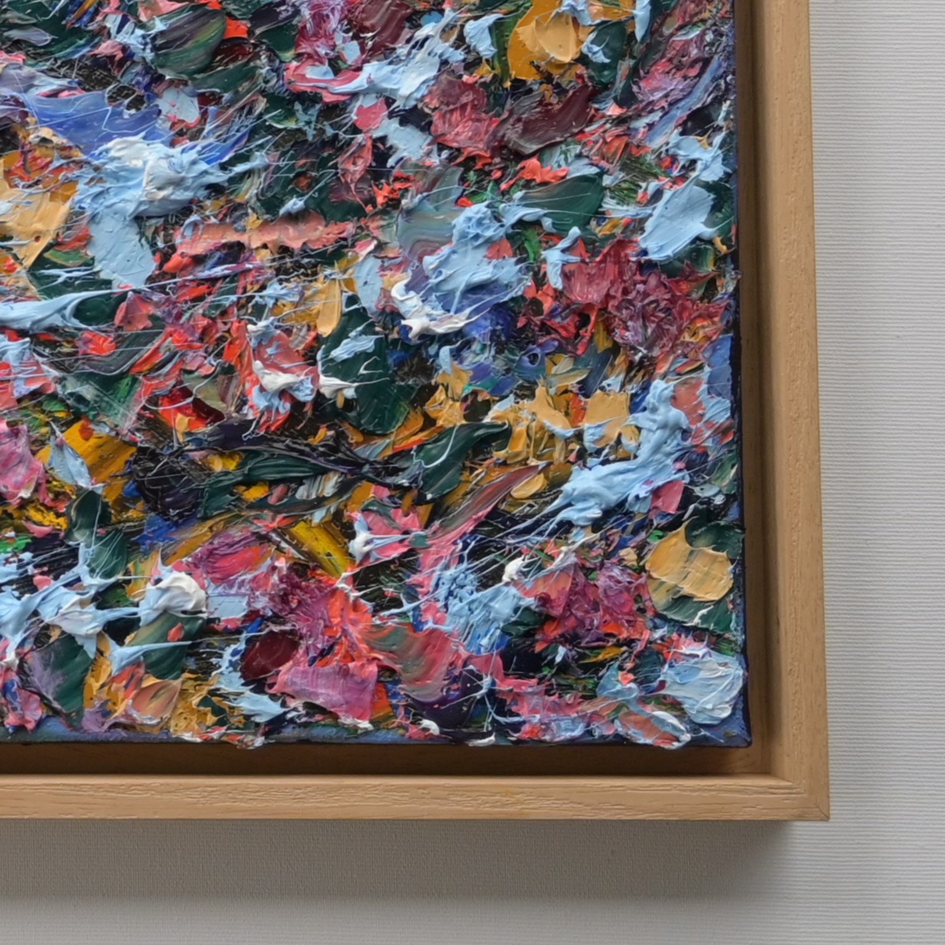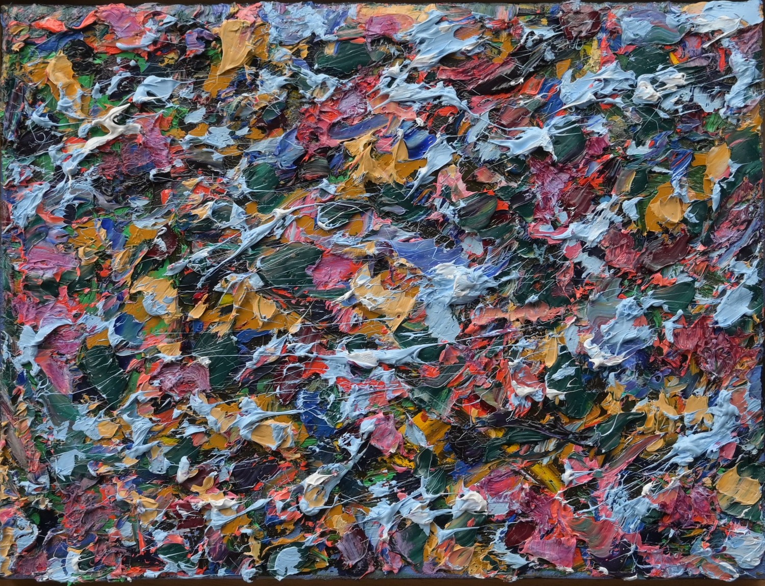 Ovaj rad bogat je bojama i teksturom. Na slici dominiraju gusti nanosi boje u različitim nijansama, uključujući crvenu, rozu, oker žutu, zelenu, nebesko plavu, ultramarine plavu i bijelu. Boje su nanesene u debelim slojevima po platnu, stvarajući dinamičan efekt.